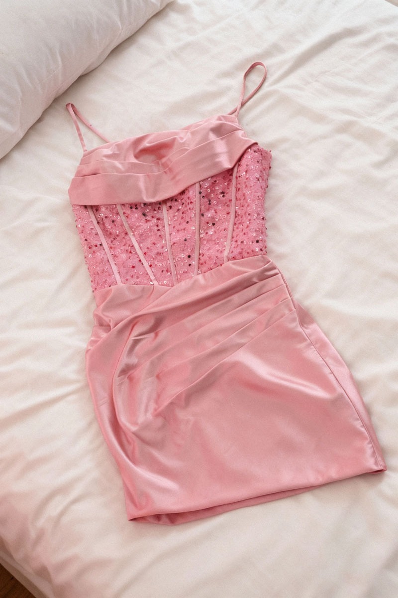 Sheath/Column Sweetheart Criss Cross Back Short/Mini Stretch Satin Knit Homecoming Dresses With Sequins #SHD10567